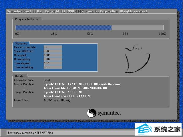 9.分区完后可进行重装系统操作;GHOST系统恢复界面图,全程为无人值守安装;