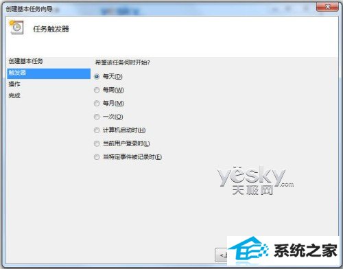 如果我们需要建立自己的任务计划,则点击菜单“操作—创建基本任务”。输入任务名称后,设置触发运行工作的条件,例如开机时运行、指定时间运行或者每隔一段时间运行,以符合不同情况的需要。